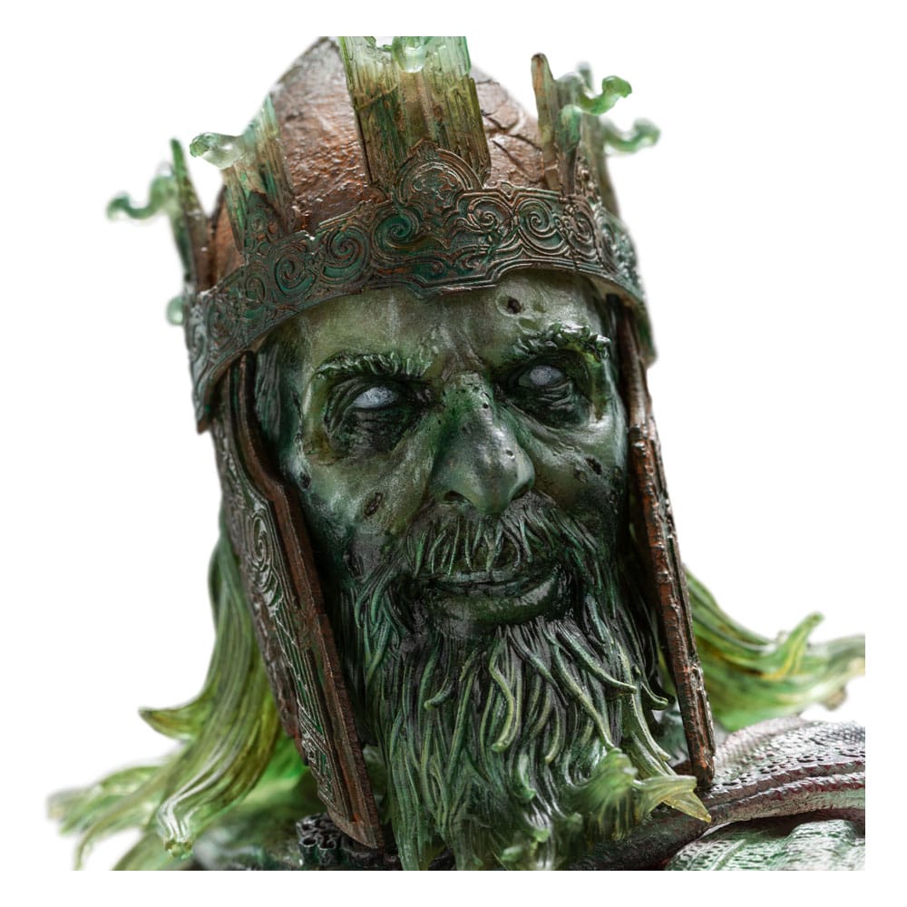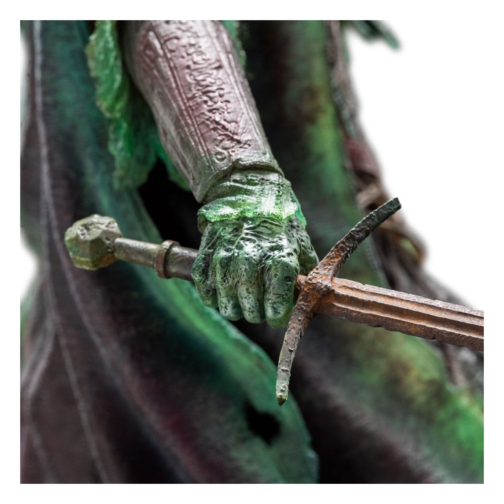 In vita, era un re; nella morte, è una leggenda. Legato da un giuramento ininterrotto, egli si erge a testimonianza dell'onore e delle terribili conseguenze delle promesse non mantenute. Lascia che la sua presenza nella tua collezione serva a ricordare l'eterna lotta tra dovere e redenzione. Con un'aura di inquietante maestosità, questa statua cattura l'essenza stessa del sovrano non morto, rendendola un must per ogni appassionato della saga senza tempo della Terra di Mezzo.