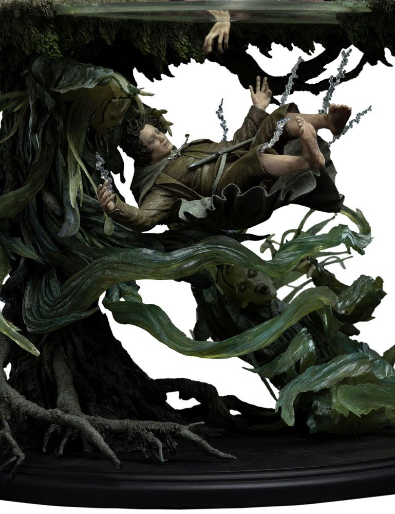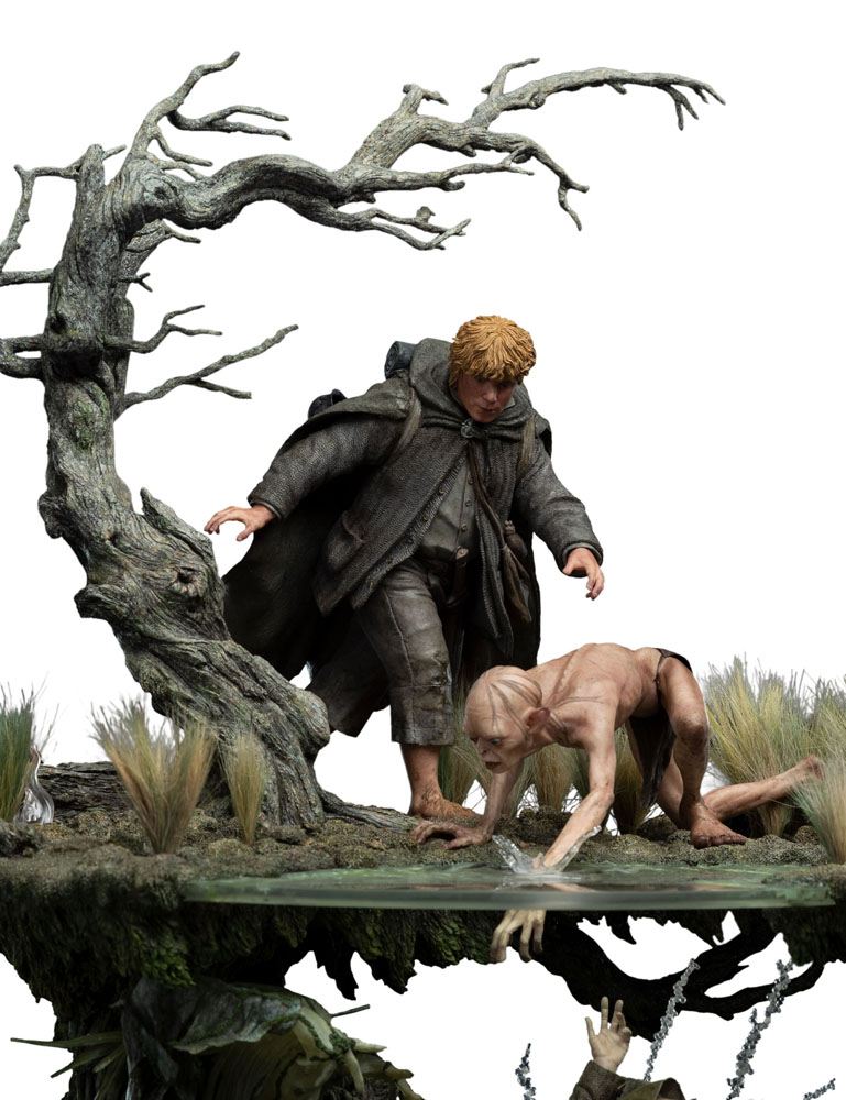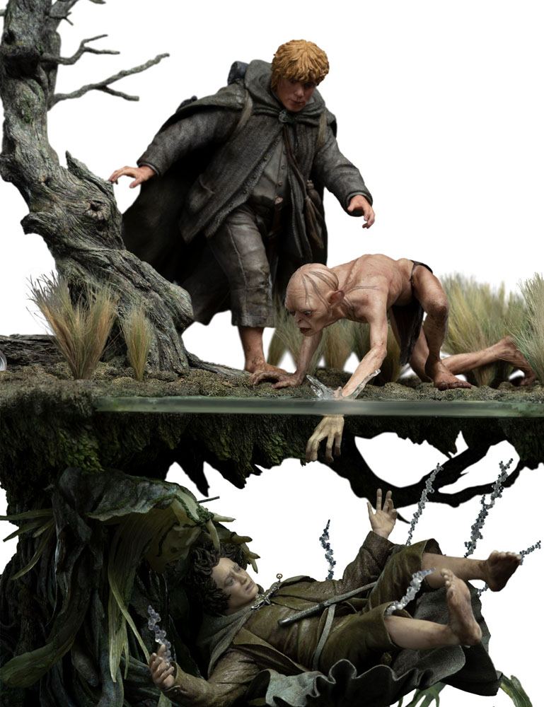 Sfruttando la natura mistica dell'ambiente e gli spiriti non morti che infestano le acque sottostanti, volevamo mostrare i due mondi che spesso si sovrappongono nella Terra di Mezzo: il magico e il mondano. Sopra le acque, Sam e Gollum cercano disperatamente di salvare lo Hobbit che affonda. Sotto le acque, gli spettri trascinano Frodo ancora più in profondità. Rappresentare questi due mondi contrastanti in un'unica scena si è rivelato fondamentale nella creazione di questo oggetto da collezione.